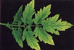 ۵-آهن: کمبود آهن باعث زرد شدن رگبرگ برگ‌ها شده و زرد شدن از قاعده برگچه ها شروع‌ شده